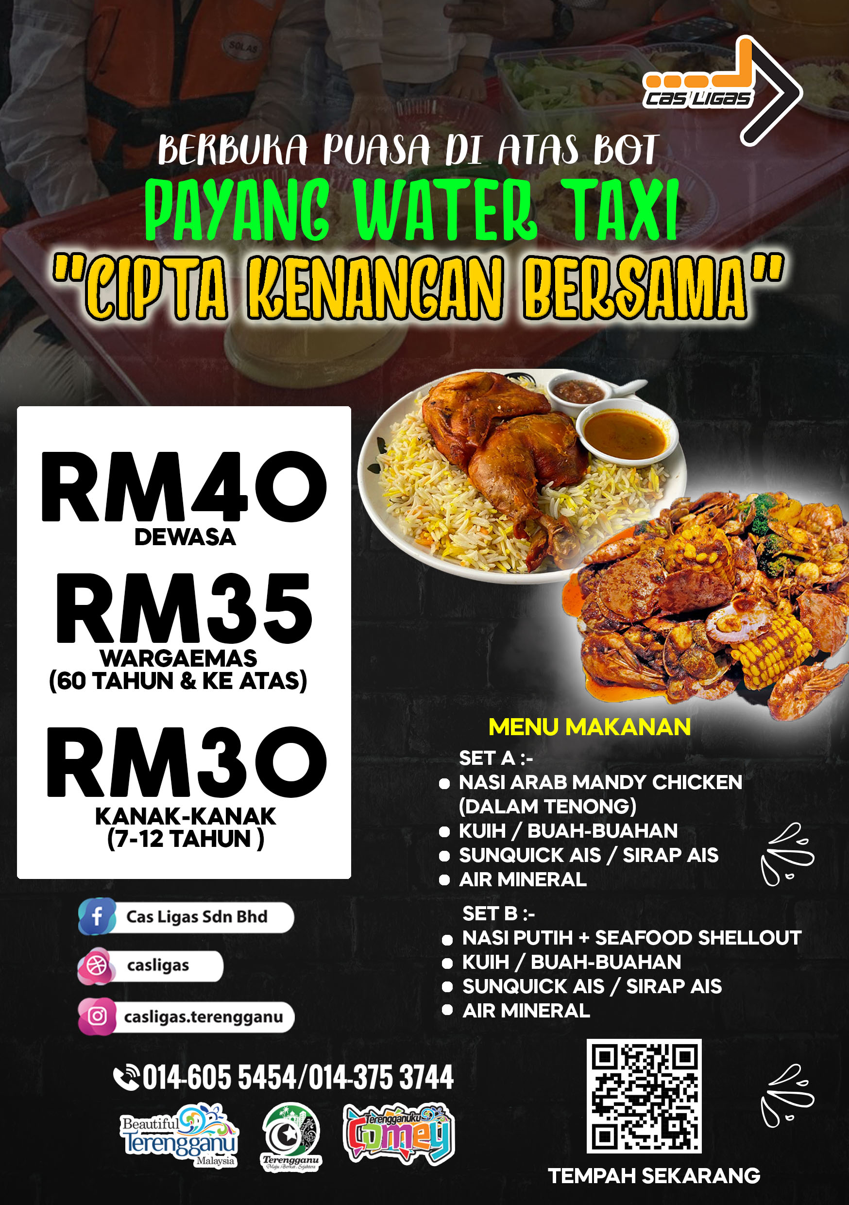 Kuala Terengganu, 28 Mac 2023 – Satu majlis berbuka puasa anjuran Cas Ligas Sdn Bhd bertempat di Payang Water Taxi River Cruise, Pulau Warisan . Majlis berbuka puasa ini telah dihadiri oleh ahli lembaga pengarah syarikat yang diketuai oleh Haji Zakaria Dagang, Pengerusi Cas Ligas Sdn Bhd, Haji Wan Adnan bin wan Derahman, Ketua Pegawai Eksekutif Kumpulan Perbadanan Memajukan Iktisad Negeri Terengganu(PMINT) dan diiringi oleh Haji Azmal bin Azaddin, Ketua Pegawai Operasi(PMINT), Encik Mohd Anuar bin Abdullah, Ketua pegawai Korporat(PMINT), Encik Wan Khairul Hakimin bin Wan Ahamad, Ahli Lembaga Pengarah Cas Ligas Sdn Bhd, Encik Ahmad Sanusi bin Ibrahim, Pengurus Besar Cas Ligas Sdn Bhd dan jemputan wakil-wakil media.