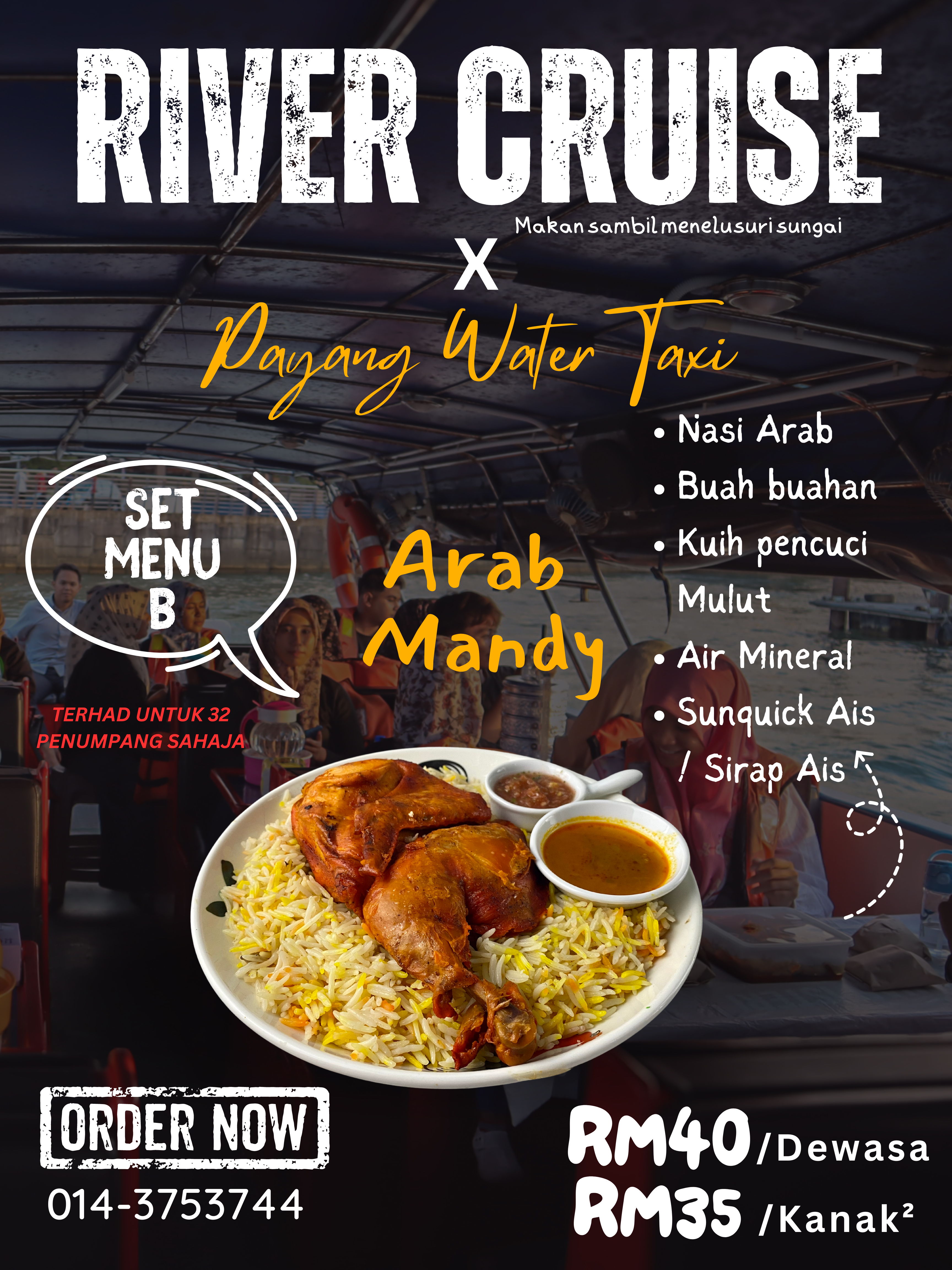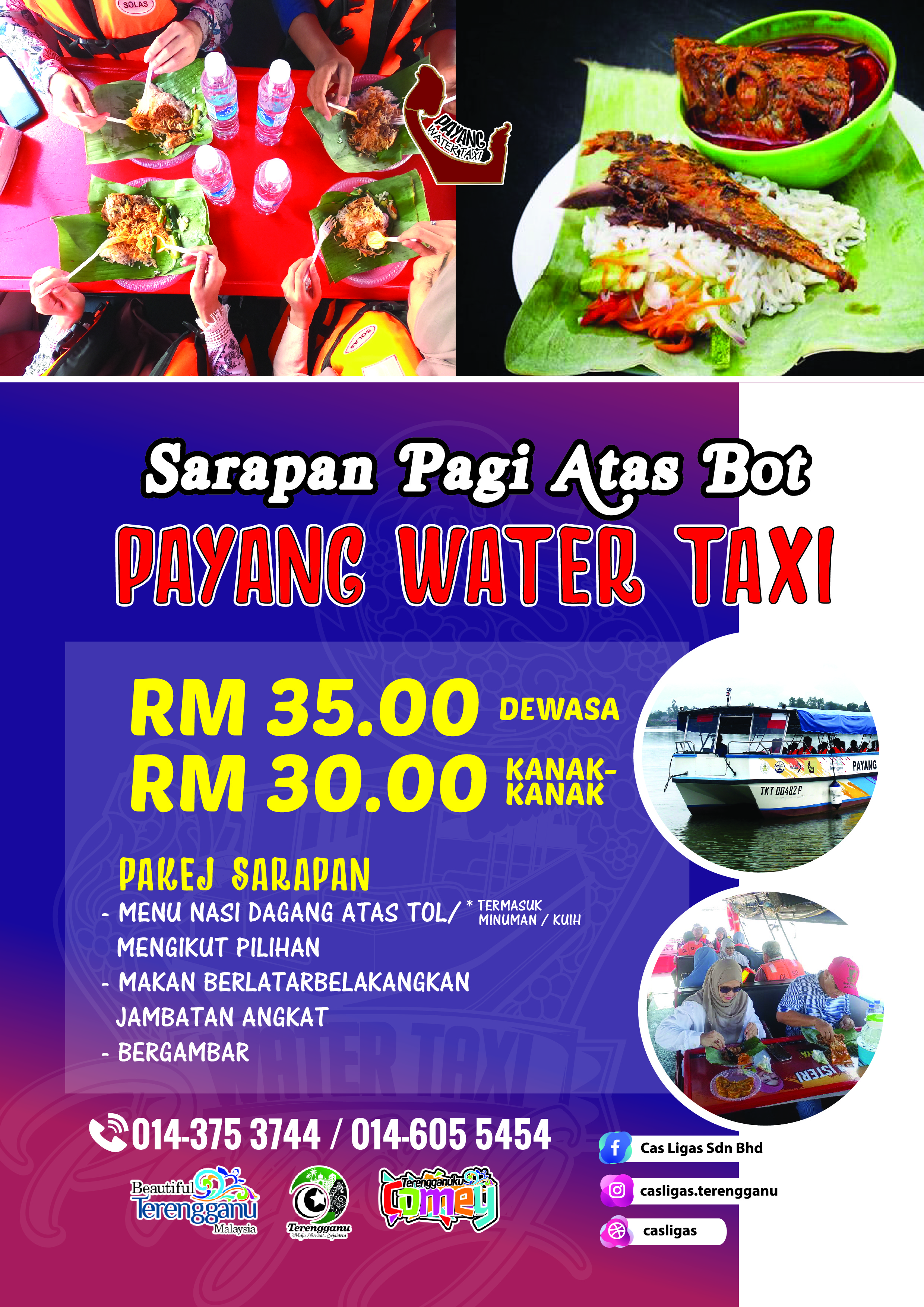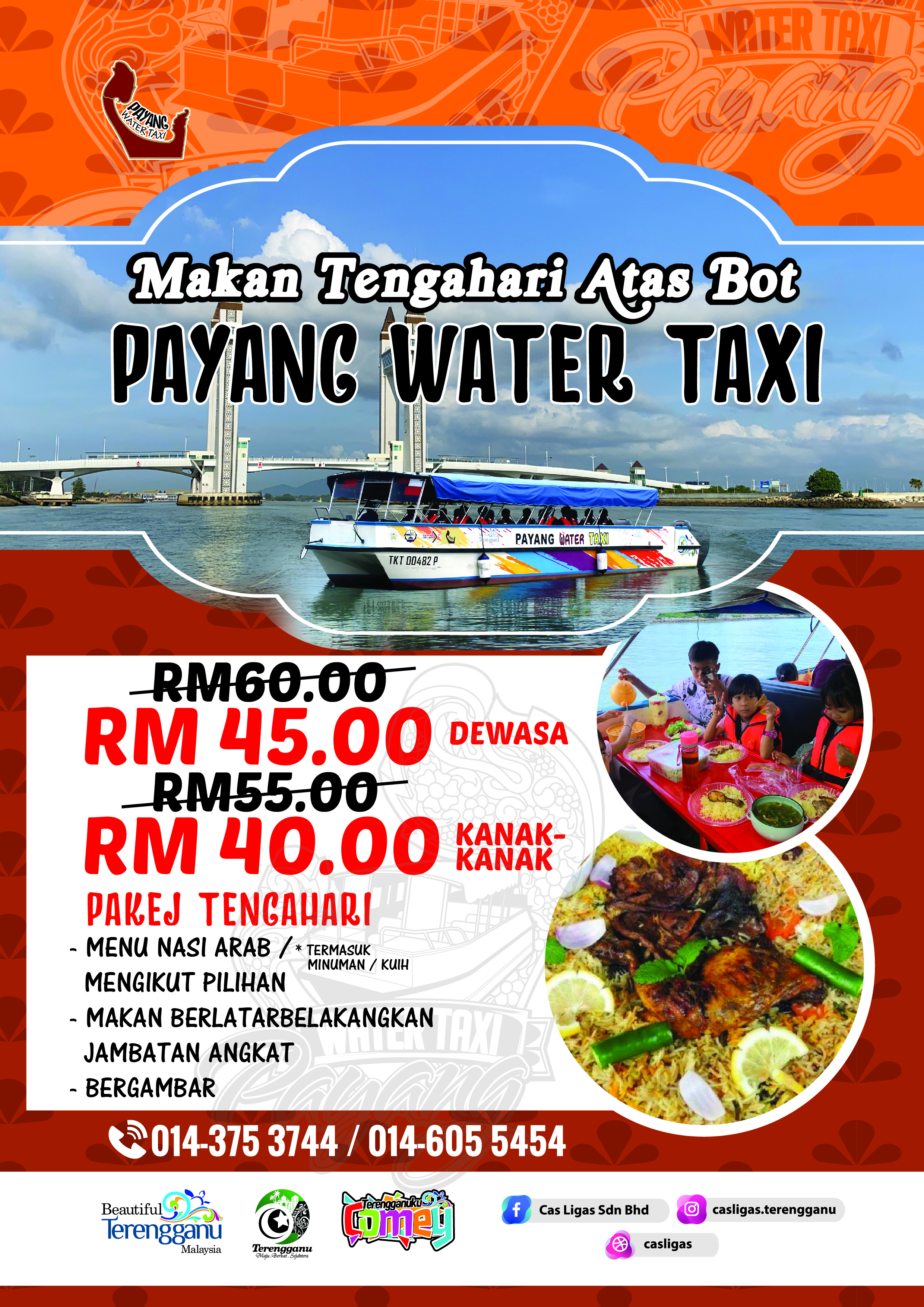 Selain itu,para pengunjung yang datang juga boleh membawa juadah sendiri untuk pakej berbuka puasa bersama bot Payang Water Taxi. Pakej ini dikenakan caj sebanyak Rm15.00/Dewasa dan Rm10.00/Kanak-Kanak. Minima 10 orang diperlukan bagi pakej berbuka puasa bot Payang Water Taxi. Tambahan, pada bulan ramadan ini juga, Payang Water Taxi turut mengadakan promosi diskaun sebanyak 50% bagi perkhidmatan river cruise. Harga asal perkhidmatan ini ialah Rm20.00/Dewasa dan Rm15.00/Kanak-Kanak. Sempena promosi ini harga perkhidmatan kami hanyalah Rm10.00/Dewasa dan Kanak-Kanak.